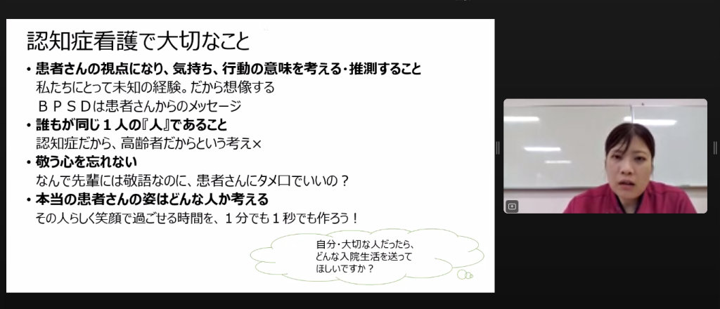 認知症の病態は医師から、認知症看護や倫理的課題、ACPについては認知症看護認定看護師から、それぞれ専門的な講義を受けました。